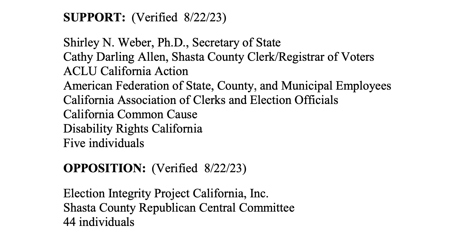 Excerpt of the August 23, 2023 Senate Bill Analysis showing a list of support and opposition, including letters from the Shasta County Republican Central Committee and 44 individuals. View the full PDF.