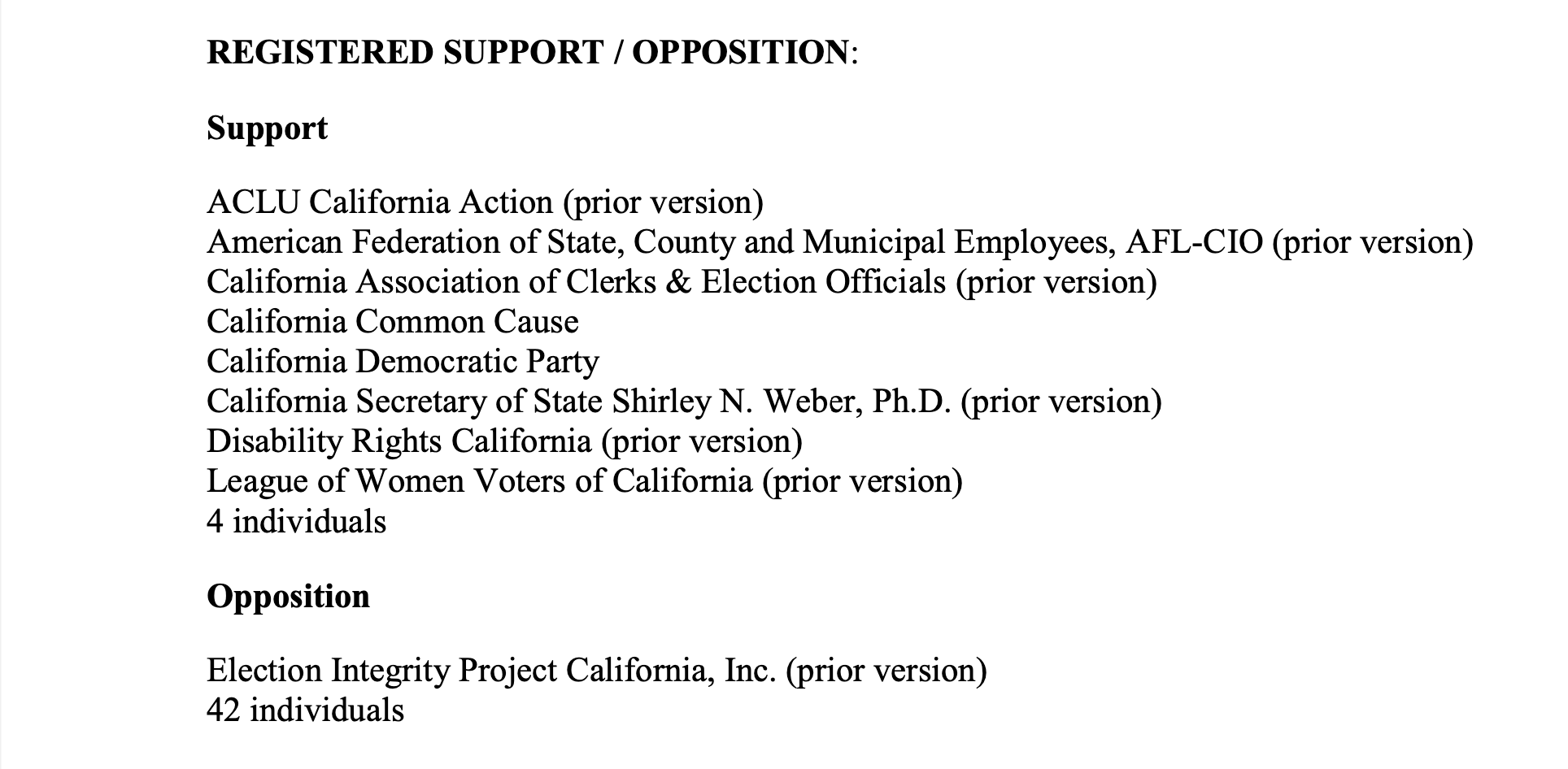 A labor union of state employees—AFL-CIO (American Federation of State, County, and Municipal Employees)—joined the California Democrat Party to lend its support, disregarding the opinions of Shasta County voters who wish to have votes counted manually as "reactionary pressure from constituents who believed misinformation." Supporting an elections-related bill isn't an obvious fit for this union, as how elections are conducted is not a topic mentioned on their web page entitled "What We Care About."